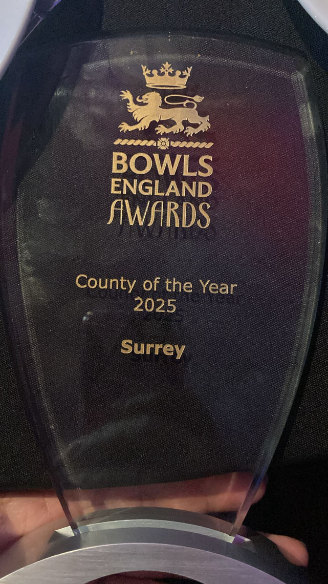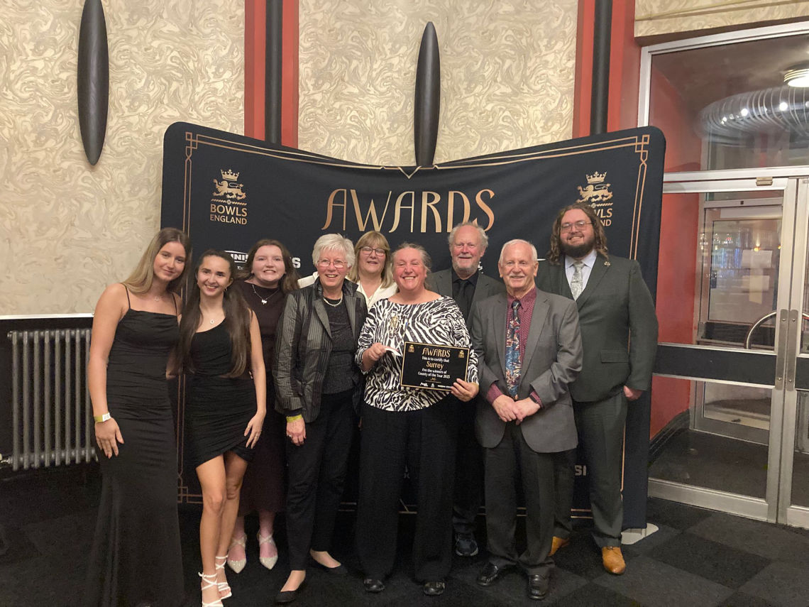 Members of Bowls Surrey displaying the COUNTY OF THE YEAR AWARD at the Bowls England awards February 2026
